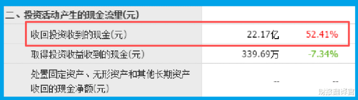 报告期内,公司收回投资收到的现金高达22.17亿元,同比大幅增长52.41%。
